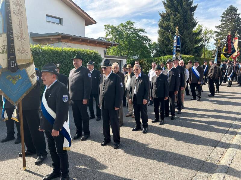 Am Samstag den 03. Mai 2025 fand unsere Jubiläumfeier statt. Nach dem Kirchenzug vom Feuerwehrhaus in Schloßberg mit den Ortsvereinen aus Stephanskirchen fand in der Pfarrkirche St. Georg der Festgottesdienst statt. Pfarrer Fabian Orsetti zelebrierte die Feier zusammen mit der Musikkapelle Stephanskirchen und dem Männergesangverein Schloßberg. Die Fahnenabordnungen der Veteranenvereine Schloßberg, Stephanskirchen, Pfaffenhofen, Leonhardspfunzen und der Feuerwehren Schloßberg, Leonhardspfunzen und Stephanskirchen bildeten sowohl im Gottesdienst als auch beim Gedenken am Kriegerdenkmal ein würdiges Bild. Karl Mair, Schirmherr und 1. Bürgermeister, erinnerte bei der Jubiläumsfeier in der Kirche, an die Geschichte unseres Vereins, und übergab uns einen Scheck in Höhe von 750,-€ zur Unterstützung des Vereins. Nach dem Gottesdienst trafen sich alle Festteilnehmer zum gemütlichen Beisammensein im Festzelt auf dem Rathausplatz.